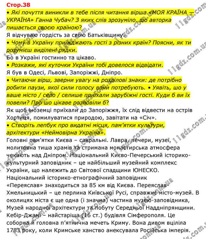 • Які почуття виникли в тебе після читання вірша «МОЯ КРАЇНА — УКРАЇНА» Ганна Чубач? З яких слів зрозуміло, шо авторка пишається своєю країною? Я відчуваю гордість за свою Батьківщину. • Чому в Україну приїжджають гості з різних країн? Поясни, як ти розумієш виділені рядки. Бо в Україні гостинно та цікаво. • Розкажи, які куточки України тобі довелося відвідати. Я був в Одесі, Львові, Запоріжжі, Дніпро. • Читаючи вірш, зверни увагу на розділові знаки: де потрібно робити паузи, якої сили голосу вони потребують. • Уявіть, шо у ваше місто / село / селише приїхали зарубіжні гості. Куди б ви їх повели? Про шо цікаве розповіли б? Як щоб іноземці приїхали до Запоріжжя, їх слід відвести на острів Хортиця, помилуватися природою, завітати на «Січ». • Створіть лепбук про видатні місця, пам’ятки культури, архітектури «Неймовірна Україна». Головні пам’ятки Києва – сакральні. Лавра, печери, музеї, молитовна тиша храмів та стримана монастирська атмосфера чекають над Дніпром. Національний Києво-Печерський історико-культурний заповідник – це найбільший музейний комплекс України, що належить до Світової спадщини ЮНЕСКО. Національний історико-етнографічний заповідник «Переяслав» знаходиться за 85 км від Києва. Переяслав-Хмельницький – це перлина Київської Русі, справжнє місто-музей. В околицях міста є ще одна (і значна) частина музею-заповідника, Музей народної архітектури та побуту Середньої Наддніпрянщини. Кебір-Джамі – найстаріша (16 ст.) будівля Сімферополя. Це соборна й головна п’ятнична мечеть Криму. Вона дивом вціліла 1783 року, коли Кримське ханство анексувала Російська імперія.