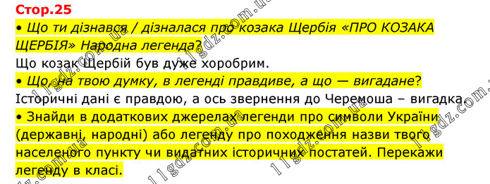 • Що ти дізнався / дізналася про козака Щербія «ПРО КОЗАКА ЩЕРБІЯ» Народна легенда? Що козак Щербій був дуже хоробрим. • Що, на твою думку, в легенді правдиве, а що — вигадане? Історичні дані є правдою, а ось звернення до Черемоша – вигадка. • Знайди в додаткових джерелах легенди про символи України (державні, народні) або легенду про походження назви твого населеного пункту чи видатних історичних постатей. Перекажи легенду в класі.