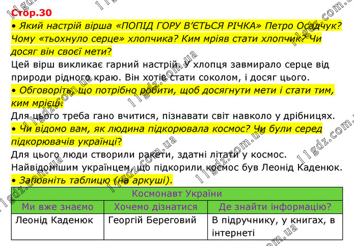• Який настрій вірша «ПОПІД ГОРУ В’ЄТЬСЯ РІЧКА» Петро Осадчук? Чому «тьохнуло серце» хлопчика? Ким мріяв стати хлопчик? Чи досяг він своєї мети? Цей вірш викликає гарний настрій. У хлопця завмирало серце від природи рідного краю. Він хотів стати соколом, і досяг цього. • Обговоріть, що потрібно робити, щоб досягнути мети і стати тим, ким мрієш. Для цього треба гано вчитися, пізнавати світ навколо у дрібницях. • Чи відомо вам, як людина підкорювала космос? Чи були серед підкорювачів українці? Для цього люди створили ракети, здатні літати у космос. Найвідомішим українцем, що підкорили космос був Леонід Каденюк. • Заповніть таблицю (на аркуші). Космонавт України Ми вже знаємо Хочемо дізнатися Де знайти інформацію? Леонід Каденюк Георгій Береговий В підручнику, у книгах, в інтернеті
