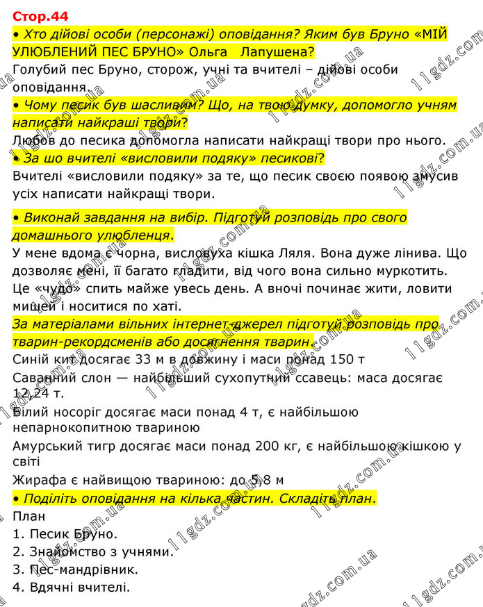 • Хто дійові особи (персонажі) оповідання? Яким був Бруно «МІЙ УЛЮБЛЕНИЙ ПЕС БРУНО» Ольга Лапушена? Голубий пес Бруно, сторож, учні та вчителі – дійові особи оповідання. • Чому песик був шасливим? Що, на твою думку, допомогло учням написати найкраші твори? Любов до песика допомогла написати найкращі твори про нього. • За шо вчителі «висловили подяку» песикові? Вчителі «висловили подяку» за те, що песик своєю появою змусив усіх написати найкращі твори. • Виконай завдання на вибір. Підготуй розповідь про свого домашнього улюбленця. У мене вдома є чорна, висловуха кішка Ляля. Вона дуже лінива. Що дозволяє мені, її багато гладити, від чого вона сильно муркотить. Це «чудо» спить майже увесь день. А вночі починає жити, ловити мишей і носитися по хаті. За матеріалами вільних інтернет-джерел підготуй розповідь про тварин-рекордсменів або досягнення тварин. • Синій кит досягає 33 м в довжину і маси понад 150 т • Саванний слон — найбільший сухопутний ссавець: маса досягає 12,24 т. • Білий носоріг досягає маси понад 4 т, є найбільшою непарнокопитною твариною • Амурський тигр досягає маси понад 200 кг, є найбільшою кішкою у світі • Жирафа є найвищою твариною: до 5,8 м • Поділіть оповідання на кілька частин. Складіть план. План 1. Песик Бруно. 2. Знайомство з учнями. 3. Пес-мандрівник. 4. Вдячні вчителі.