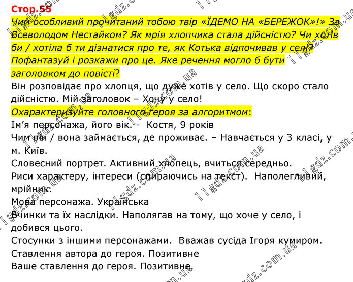 Чим особливий прочитаний тобою твір «ЇДЕМО НА «БЕРЕЖОК»!» За Всеволодом Нестайком? Як мрія хлопчика стала дійсністю? Чи хотів би / хотіла б ти дізнатися про те, як Котька відпочивав у селі? Пофантазуй і розкажи про це. Яке речення могло б бути заголовком до повісті? Він розповідає про хлопця, що дуже хотів у село. Що скоро стало дійсністю. Мій заголовок – Хочу у село! Охарактеризуйте головного героя за алгоритмом: Ім’я персонажа, його вік. - Костя, 9 років Чим він / вона займається, де проживає. – Навчається у 3 класі, у м. Київ. Словесний портрет. Активний хлопець, вчиться середньо. Риси характеру, інтереси (спираючись на текст). Наполегливий, мрійник. Мова персонажа. Українська Вчинки та їх наслідки. Наполягав на тому, що хоче у село, і добився цього. Стосунки з іншими персонажами. Вважав сусіда Ігоря кумиром. Ставлення автора до героя. Позитивне Ваше ставлення до героя. Позитивне.