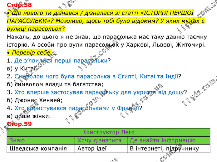 • Що нового ти дізнався / дізналася зі статті «ІСТОРІЯ ПЕРШОЇ ПАРАСОЛЬКИ»? Можливо, щось тобі було відомим? У яких містах є вулиці парасольок? Нажаль, до цього я не знав, що парасолька має таку давню таємну історію. А особи про вули парасольок у Харкові, Львові, Житомирі. • Перевір себе. 1. Де з’явилися перші парасольки? в) у Китаї. 2. Символом чого була парасолька в Єгипті, Китаї та Індії? б) символом влади та багатства; 3. Хто вперше застосував парасольку для укриття від дощу? б) Джонас Хенвей; 4. Хто користувався парасольками у Франції? в) лише жінки.