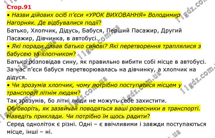 • Назви дійових осіб п’єси «УРОК ВИХОВАННЯ» Володимир Нагорняк. Де відбувалися події? Батько, Хлопчик, Дідусь, Бабуся, Перший Пасажир, Другий Пасажир, Дівчинка, в автобусі. • Які поради давав батько синові? Які перетворення траплялися з бабусею та хлопчиком? Батько розповідав сину, як правильно вибити собі місце в автобусі. За час п’єси бабуся перетворювалась на дівчинку, а хлопчик на дідуся. • Чи зрозумів хлопчик, чому потрібно поступатися місцем у транспорті літнім людям? Так зрозумів, бо літні люди не можуть себе захистити. Обговоріть, як зазвичай поводяться ваші ровесники в транспорті. Наведіть приклади. Чи потрібно їм щось радити? Серед одноліток є різні. Одні – є ввічливими і завжди поступаються місце, інші – ні.
