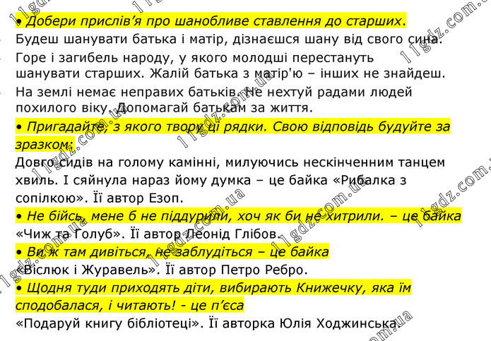 • Добери прислів’я про шанобливе ставлення до старших. • Будеш шанувати батька і матір, дізнаєшся шану від свого сина. • Горе і загибель народу, у якого молодші перестануть шанувати старших. Жалій батька з матір'ю – інших не знайдеш. • На землі немає неправих батьків. Не нехтуй радами людей похилого віку. Допомагай батькам за життя. • Пригадайте, з якого твору ці рядки. Свою відповідь будуйте за зразком: Довго сидів на голому камінні, милуючись нескінченним танцем хвиль. І сяйнула нараз йому думка – це байка «Рибалка з сопілкою». Її автор Езоп. • Не бійсь, мене б не піддурили, хоч як би не хитрили. – це байка «Чиж та Голуб». Її автор Леонід Глібов. • Ви ж там дивіться, не заблудіться – це байка «Віслюк і Журавель». Її автор Петро Ребро. • Щодня туди приходять діти, вибирають Книжечку, яка їм сподобалася, і читають! - це п’єса «Подаруй книгу бібліотеці». Її авторка Юлія Ходжинська.