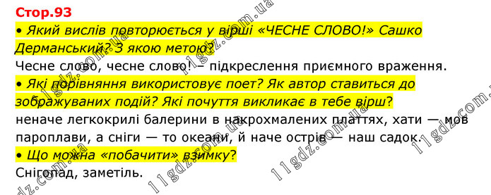 • Який вислів повторюється у вірші «ЧЕСНЕ СЛОВО!» Сашко Дерманський? З якою метою? Чесне слово, чесне слово! – підкреслення приємного враження. • Які порівняння використовує поет? Як автор ставиться до зображуваних подій? Які почуття викликає в тебе вірш? неначе легкокрилі балерини в накрохмалених платтях, хати — мов пароплави, а сніги — то океани, й наче острів — наш садок. • Що можна «побачити» взимку? Снігопад, заметіль.