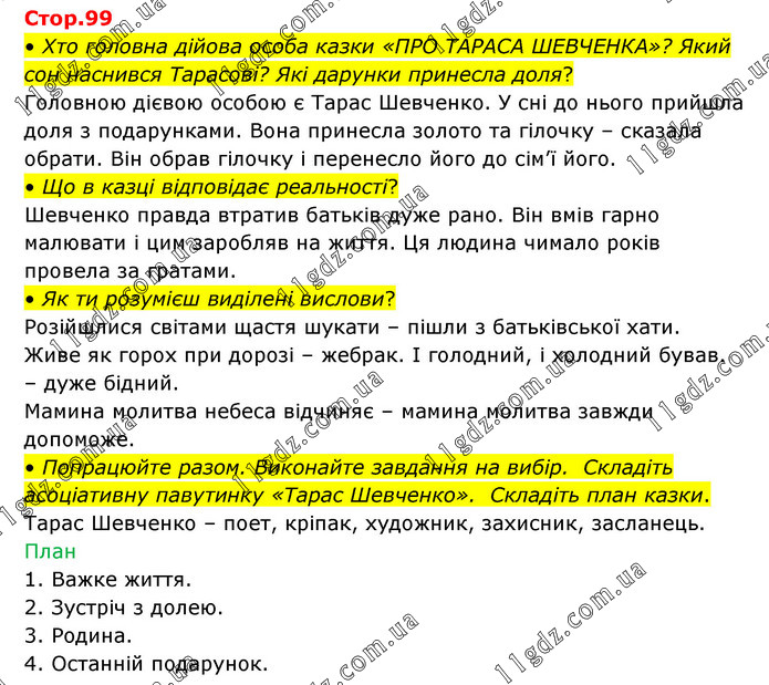 • Хто головна дійова особа казки «ПРО ТАРАСА ШЕВЧЕНКА»? Який сон наснився Тарасові? Які дарунки принесла доля? Головною дієвою особою є Тарас Шевченко. У сні до нього прийшла доля з подарунками. Вона принесла золото та гілочку – сказала обрати. Він обрав гілочку і перенесло його до сім’ї його. • Що в казці відповідає реальності? Шевченко правда втратив батьків дуже рано. Він вмів гарно малювати і цим заробляв на життя. Ця людина чимало років провела за гратами. • Як ти розумієш виділені вислови? Розійшлися світами щастя шукати – пішли з батьківської хати. Живе як горох при дорозі – жебрак. І голодний, і холодний бував. – дуже бідний. Мамина молитва небеса відчиняє – мамина молитва завжди допоможе. • Попрацюйте разом. Виконайте завдання на вибір. Складіть асоціативну павутинку «Тарас Шевченко». Складіть план казки. Тарас Шевченко – поет, кріпак, художник, захисник, засланець. План 1. Важке життя. 2. Зустріч з долею. 3. Родина. 4. Останній подарунок.