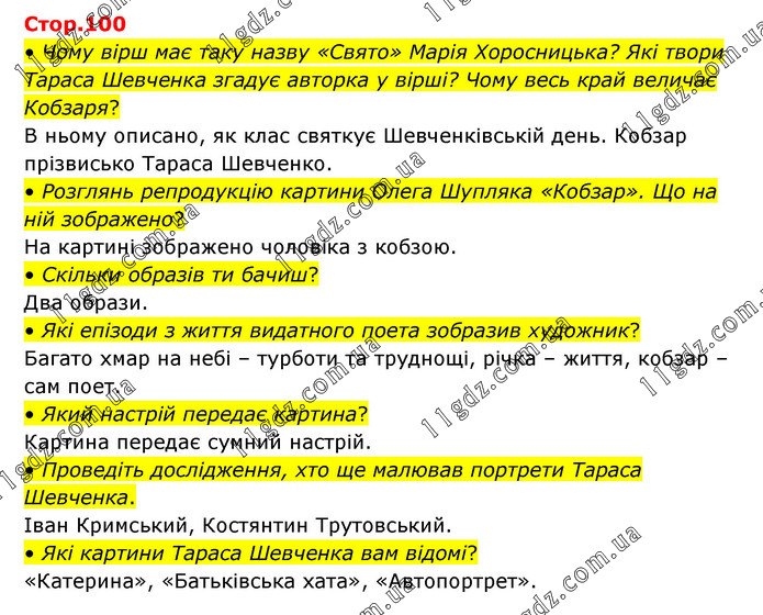 • Чому вірш має таку назву «Свято» Марія Хоросницька? Які твори Тараса Шевченка згадує авторка у вірші? Чому весь край величає Кобзаря? В ньому описано, як клас святкує Шевченківській день. Кобзар прізвисько Тараса Шевченко. • Розглянь репродукцію картини Олега Шупляка «Кобзар». Що на ній зображено? На картині зображено чоловіка з кобзою. • Скільки образів ти бачиш? Два образи. • Які епізоди з життя видатного поета зобразив художник? Багато хмар на небі – турботи та труднощі, річка – життя, кобзар – сам поет. • Який настрій передає картина? Картина передає сумний настрій. • Проведіть дослідження, хто ще малював портрети Тараса Шевченка. Іван Кримський, Костянтин Трутовський. • Які картини Тараса Шевченка вам відомі? «Катерина», «Батьківська хата», «Автопортрет».