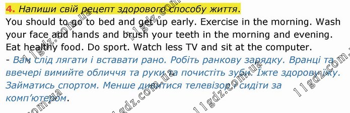 Напиши свій рецепт здорового способу життя. You should to go to bed and get up early. Exercise in the morning. Wash your face and hands and brush your teeth in the morning and evening. Eat healthy food. Do sport. Watch less TV and sit at the computer. - Вам слід лягати і вставати рано. Робіть ранкову зарядку. Вранці та ввечері вимийте обличчя та руки та почистіть зуби. Їжте здорову їжу. Займатись спортом. Менше дивитися телевізор і сидіти за комп’ютером.