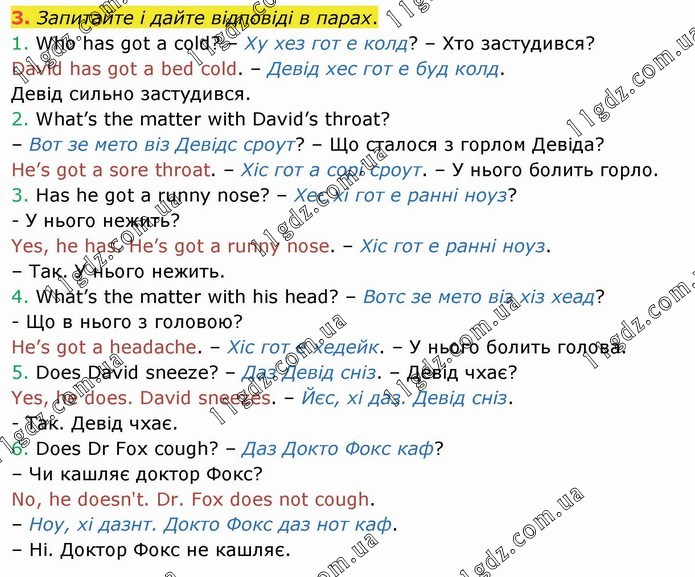 Запитайте і дайте відповіді в парах. 1. Who has got a cold? – Ху хез гот е колд? – Хто застудився? David has got a bed cold. – Девід хес гот е буд колд. Девід сильно застудився. 2. What’s the matter with David’s throat? – Вот зе мето віз Девідс сроут? – Що сталося з горлом Девіда? He’s got a sore throat. – Хіс гот а сорі сроут. – У нього болить горло. 3. Has he got a runny nose? – Хес хі гот е ранні ноуз? - У нього нежить? Yes, he has. He’s got a runny nose. – Хіс гот е ранні ноуз. – Так. У нього нежить. 4. What’s the matter with his head? – Вотс зе мето віз хіз хеад? - Що в нього з головою? He’s got a headache. – Хіс гот е хедейк. – У нього болить голова. 5. Does David sneeze? – Даз Девід сніз. – Девід чхає? Yes, he does. David sneezes. – Йєс, хі даз. Девід сніз. - Так. Девід чхає. 6. Does Dr Fox cough? – Даз Докто Фокс каф? – Чи кашляє доктор Фокс? No, he doesn't. Dr. Fox does not cough. – Ноу, хі дазнт. Докто Фокс даз нот каф. – Ні. Доктор Фокс не кашляє.