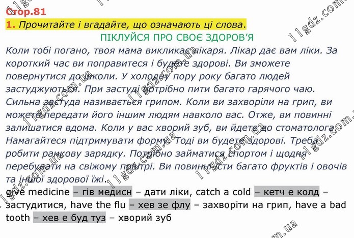 Прочитайте і вгадайте, що означають ці слова. ПІКЛУЙСЯ ПРО СВОЄ ЗДОРОВ’Я Коли тобі погано, твоя мама викликає лікаря. Лікар дає вам ліки. За короткий час ви поправитеся і будете здорові. Ви зможете повернутися до школи. У холодну пору року багато людей застуджуються. При застуді потрібно пити багато гарячого чаю. Сильна застуда називається грипом. Коли ви захворіли на грип, ви можете передати його іншим людям навколо вас. Отже, ви повинні залишатися вдома. Коли у вас хворий зуб, ви йдете до стоматолога. Намагайтеся підтримувати форму. Тоді ви будете здорові. Треба робити ранкову зарядку. Потрібно займатися спортом і щодня перебувати на свіжому повітрі. Ви повинні їсти багато фруктів і овочів та іншої здорової їжі. give medicine – гів медисн – дати ліки, catch a cold – кетч е колд – застудитися, have the flu – хев зе флу – захворіти на грип, have a bad tooth – хев е буд туз – хворий зуб