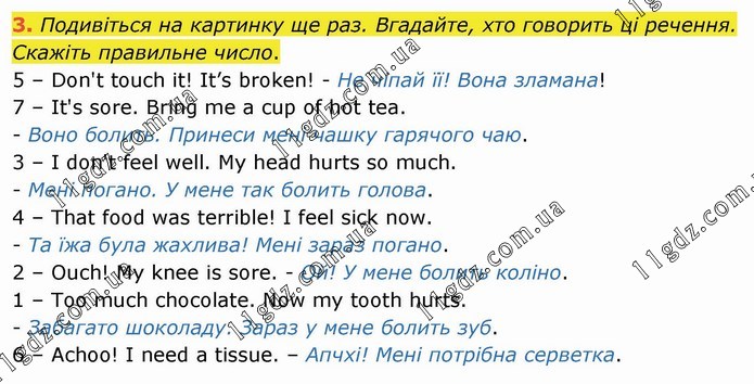 Подивіться на картинку ще раз. Вгадайте, хто говорить ці речення. Скажіть правильне число. 5 – Don't touch it! It’s broken! - Не чіпай її! Вона зламана! 7 – It's sore. Bring me a cup of hot tea. - Воно болить. Принеси мені чашку гарячого чаю. 3 – I don't feel well. My head hurts so much. - Мені погано. У мене так болить голова. 4 – That food was terrible! I feel sick now. - Та їжа була жахлива! Мені зараз погано. 2 – Ouch! My knee is sore. - Ой! У мене болить коліно. 1 – Too much chocolate. Now my tooth hurts. - Забагато шоколаду. Зараз у мене болить зуб. 6 – Achoo! I need a tissue. – Апчхі! Мені потрібна серветка.