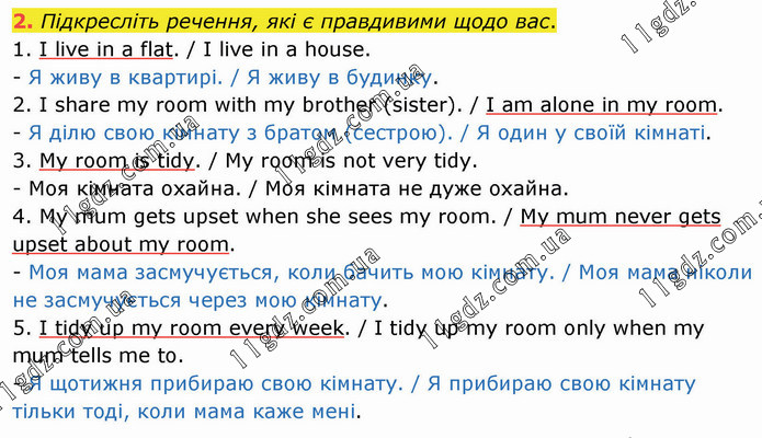 Підкресліть речення, які є правдивими щодо вас. 1. I live in a flat. / I live in a house. - Я живу в квартирі. / Я живу в будинку. 2. I share my room with my brother (sister). / I am alone in my room. - Я ділю свою кімнату з братом (сестрою). / Я один у своїй кімнаті. 3. My room is tidy. / My room is not very tidy. - Моя кімната охайна. / Моя кімната не дуже охайна. 4. My mum gets upset when she sees my room. / My mum never gets upset about my room. - Моя мама засмучується, коли бачить мою кімнату. / Моя мама ніколи не засмучується через мою кімнату. 5. I tidy up my room every week. / I tidy up my room only when my mum tells me to. - Я щотижня прибираю свою кімнату. / Я прибираю свою кімнату тільки тоді, коли мама каже мені.