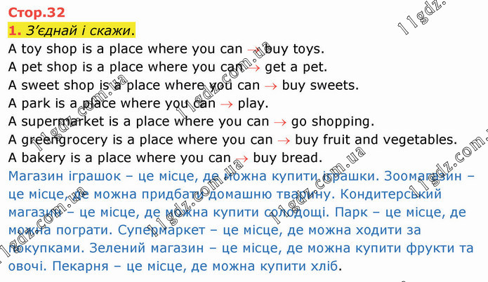 З’єднай і скажи. A toy shop is a place where you can buy toys. A pet shop is a place where you can get a pet. A sweet shop is a place where you can buy sweets. A park is a place where you can play. A supermarket is a place where you can go shopping. A greengrocery is a place where you can buy fruit and vegetables. A bakery is a place where you can buy bread.