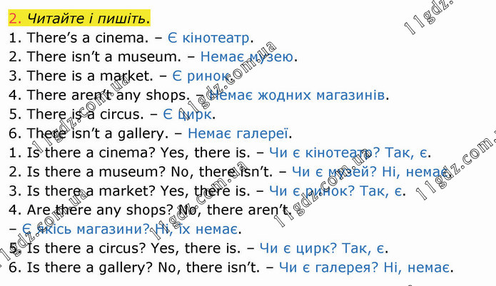 Читайте і пишіть. 1. There’s a cinema. – Є кінотеатр. 2. There isn’t a museum. – Немає музею. 3. There is a market. – Є ринок. 4. There aren’t any shops. – Немає жодних магазинів. 5. There is a circus. – Є цирк. 6. There isn’t a gallery. – Немає галереї. 1. Is there a cinema? Yes, there is. – Чи є кінотеатр? Так, є. 2. Is there a museum? No, there isn’t. – Чи є музей? Ні, немає. 3. Is there a market? Yes, there is. – Чи є ринок? Так, є. 4. Are there any shops? No, there aren’t. – Є якісь магазини? Ні, їх немає. 5. Is there a circus? Yes, there is. – Чи є цирк? Так, є. 6. Is there a gallery? No, there isn’t.