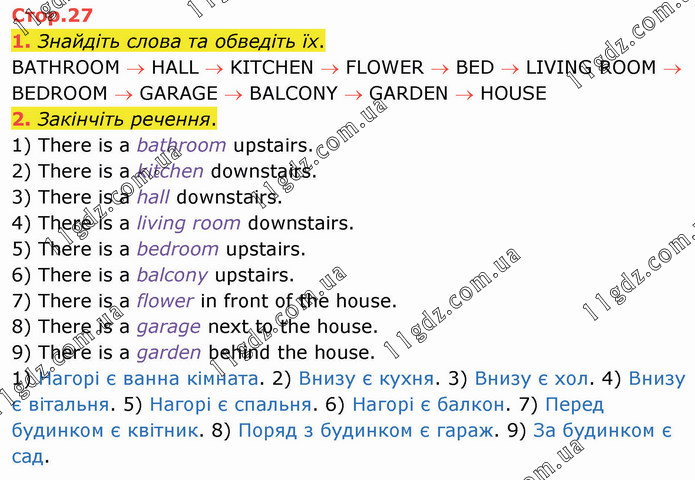 Знайдіть слова та обведіть їх. BATHROOM HALL KITCHEN FLOWER BED LIVING ROOM BEDROOM GARAGE BALCONY GARDEN HOUSE 2. Закінчіть речення. 1) There is a bathroom upstairs. 2) There is a kitchen downstairs. 3) There is a hall downstairs. 4) There is a living room downstairs. 5) There is a bedroom upstairs. 6) There is a balcony upstairs. 7) There is a flower in front of the house. 8) There is a garage next to the house. 9) There is a garden behind the house. 1) Нагорі є ванна кімната. 2) Внизу є кухня. 3) Внизу є хол. 4) Внизу є вітальня. 5) Нагорі є спальня. 6) Нагорі є балкон. 7) Перед будинком є квітник. 8) Поряд з будинком є гараж. 9) За будинком є сад.