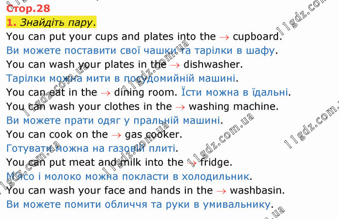Знайдіть пару. You can put your cups and plates into the cupboard. Ви можете поставити свої чашки та тарілки в шафу. You can wash your plates in the dishwasher. Тарілки можна мити в посудомийній машині. You can eat in the dining room. Їсти можна в їдальні. You can wash your clothes in the washing machine. Ви можете прати одяг у пральній машині. You can cook on the gas cooker. Готувати можна на газовій плиті. You can put meat and milk into the fridge. М’ясо і молоко можна покласти в холодильник. You can wash your face and hands in the washbasin. Ви можете помити обличчя та руки в умивальнику.