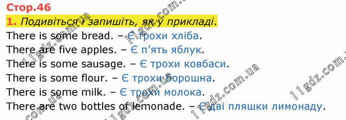 Подивіться і запишіть, як у прикладі. There is some bread. – Є трохи хліба. There are five apples. – Є п’ять яблук. There is some sausage. – Є трохи ковбаси. There is some flour. – Є трохи борошна. There is some milk. – Є трохи молока. There are two bottles of lemonade. – Є дві пляшки лимонаду.