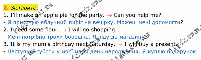 Зіставите. 1. I’ll make an apple pie for the party. Can you help me? - Я приготую яблучний пиріг на вечірку. Можеш мені допомогти? 2. I need some flour. I will go shopping. - Мені потрібно трохи борошна. Я піду до магазину. 3. It is my mum’s birthday next Saturday. I will buy a present. - Наступної суботи у моєї мами день народження. Я куплю подарунок.