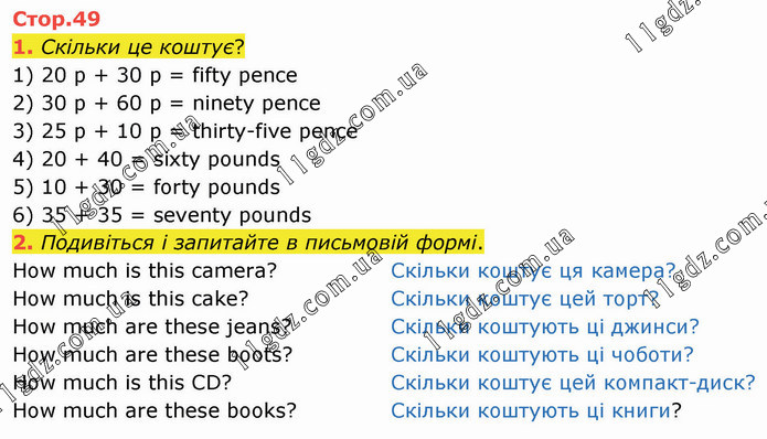 Скільки це коштує? 1) 20 p + 30 p = fifty pence 2) 30 p + 60 p = ninety pence 3) 25 p + 10 p = thirty-five pence 4) 20 + 40 = sixty pounds 5) 10 + 30 = forty pounds 6) 35 + 35 = seventy pounds 2. Подивіться і запитайте в письмовій формі. How much is this camera? How much is this cake? How much are these jeans? How much are these boots? How much is this CD? How much are these books?