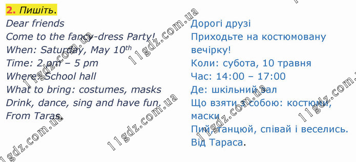 Пишіть. Dear friends Come to the fancy-dress Party! When: Saturday, May 10th Time: 2 pm – 5 pm Where: School hall What to bring: costumes, masks Drink, dance, sing and have fun. From Taras.