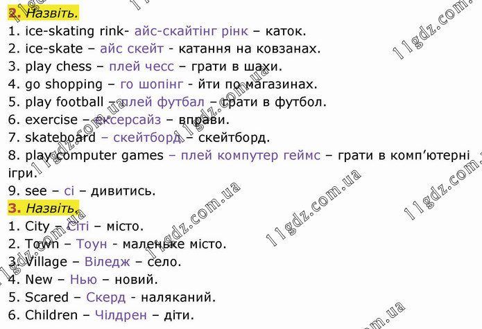 2. Назвіть. 1. ice-skating rink- айс-скайтінг рінк – каток. 2. ice-skate – айс скейт - катання на ковзанах. 3. play chess – плей чесс – грати в шахи. 4. go shopping – го шопінг - йти по магазинах. 5. play football – плей футбал – грати в футбол. 6. exercise – ексерсайз – вправи. 7. skateboard – скейтборд – скейтборд. 8. play computer games – плей компутер геймс – грати в комп’ютерні ігри. 9. see – сі – дивитись. 3. Назвіть. 1. City – Сіті – місто. 2. Town – Тоун - маленьке місто. 3. Village – Віледж – село. 4. New – Нью – новий. 5. Scared – Скерд - наляканий. 6. Children – Чілдрен – діти.