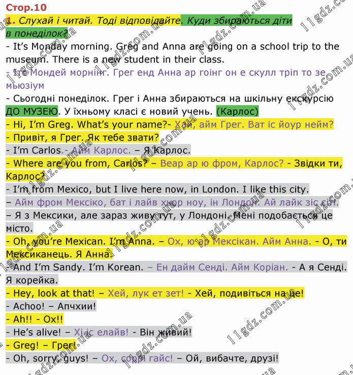 1. Слухай і читай. Тоді відповідайте. Куди збираються діти в понеділок? - It’s Monday morning. Greg and Anna are going on a school trip to the museum. There is a new student in their class. - Ітс Мондей морнінг. Грег енд Анна ар гоінг он е скулл тріп то зе мьюзіум - Сьогодні понеділок. Грег і Анна збираються на шкільну екскурсію ДО МУЗЕЮ. У їхньому класі є новий учень. (Карлос) - Hi, I’m Greg. What’s your name?- Хай, айм Грег. Ват іс йоур нейм? - Привіт, я Грег. Як тебе звати? - I’m Carlos.- Айм Карлос. – Я Карлос. - Where are you from, Carlos? – Веар ар ю фром, Карлос? - Звідки ти, Карлос? - I’m from Mexico, but I live here now, in London. I like this city. – Айм фром Мексіко, бат і лайв хьор ноу, ін Лондон. Ай лайк зіс сіті. – Я з Мексики, але зараз живу тут, у Лондоні. Мені подобається це місто. - Oh, you’re Mexican. I’m Anna. – Ох, ю ар Мексікан. Айм Анна. - О, ти Мексиканець. Я Анна. - And I’m Sandy. I’m Korean. – Ен дайм Сенді. Айм Коріан. - А я Сенді. Я корейка. - Hey, look at that! – Хей, лук ет зет! - Хей, подивіться на це! - Achoo! – Апчхии! - Ah!! - Ох!! - He’s alive! – Хі іс елайв! - Він живий! - Greg! – Грег! - Oh, sorry, guys! – Ох, соррі гайс! – Ой, вибачте, друзі!