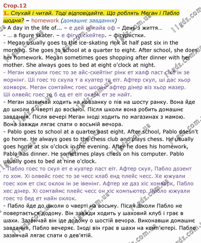 Слухай і читай. Тоді відповідайте. Що роблять Меган і Пабло щодня? – homework (домашнє завдання) - A day in the life of... – е дей ін лайв оф – День з життя… - … a figure skater. – е фігур скейтер. – фігуристки. - Megan usually goes to the ice-skating rink at half past six in the morning. She goes to school at a quarter to eight. After school, she does her homework. Megan sometimes goes shopping after dinner with her mother. She always goes to bed at eight o'clock at night. - Меган южуали гоес то зе айс-скейтінг рінк ет халф паст сікс ін зе морнінг. Ші гоес то скула т а куатер то еіт. Афтер скул, ші дас хьор хомворк. Меган сомтаймс гоес шопінг афтер дінер віз хьор мазер. Ші олвейс гоес то б ед ет еіт оклок ет зе найт. - Меган зазвичай ходить на ковзанку о пів на шосту ранку. Вона йде до школи о чверті до восьмої. Після школи вона робить домашнє завдання. Після вечері Меган іноді ходить по магазинах з мамою. Вона завжди лягає спати о восьмій вечора. - Pablo goes to school at a quarter past eight. After school, Pablo doesn't go home. He always goes to the chess club and plays chess. He usually goes home at six o'clock in the evening. After he does his homework, Pablo has dinner. He sometimes plays chess on his computer. Pablo usually goes to bed at nine o'clock. - Пабло гоес то скул ет е куатер паст еіт. Афтер скул, Пабло дозент го хом. Хі олвейс гоес то зе чесс клаб енд плейс чесс. Хе южуали гоес хом ет сікс оклок ін зе івенінг. Афтер хе даз хіс хомворк, Пабло хес дінер. Хі сомтаймс плейс чесс он хіс компьютер. Пабло южуали гоес то бед ет найн оклок. - Пабло йде до школи о чверті на восьму. Після школи Пабло не повертається додому. Він завжди ходить у шаховий клуб і грає в шахи. Зазвичай він іде додому о шостій вечора. Виконавши домашнє завдання, Пабло вечеряє. Іноді він грає в шахи на комп’ютері. Пабло зазвичай лягає спати о дев’ятій.