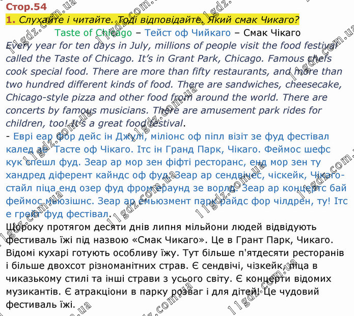 1. Слухайте і читайте. Тоді відповідайте. Який смак Чикаго? Taste of Chicago – Тейст оф Чийкаго – Смак Чікаго Every year for ten days in July, millions of people visit the food festival called the Taste of Chicago. It’s in Grant Park, Chicago. Famous chefs cook special food. There are more than fifty restaurants, and more than two hundred different kinds of food. There are sandwiches, cheesecake, Chicago-style pizza and other food from around the world. There are concerts by famous musicians. There are amusement park rides for children, too! It’s a great food festival. - Еврі еар фор дейс ін Джулі, міліонс оф піпл візіт зе фуд фестівал калед зе Тасте оф Чікаго. Ітс ін Гранд Парк, Чікаго. Феймос шефс кук спешл фуд. Зеар ар мор зен фіфті ресторанс, енд мор зен ту хандред діферент кайндс оф фуд. Зеар ар сендвічес, чіскейк, Чікаго-стайл піца енд озер фуд фром ераунд зе ворлд. Зеар ар концертс бай феймос мьюзішнс. Зеар ар емьюзмент парк райдс фор чілдрен, ту! Ітс е грейт фуд фестівал. Щороку протягом десяти днів липня мільйони людей відвідують фестиваль їжі під назвою «Смак Чикаго». Це в Грант Парк, Чикаго. Відомі кухарі готують особливу їжу. Тут більше п'ятдесяти ресторанів і більше двохсот різноманітних страв. Є сендвічі, чізкейк, піца в чиказькому стилі та інші страви з усього світу. Є концерти відомих музикантів. Є атракціони в парку розваг і для дітей! Це чудовий фестиваль їжі.