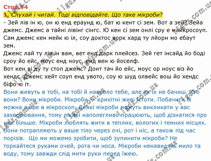 Вони живуть в тобі, на тобі й навколо тебе, але ти їх не бачиш. Хто вони? Вони мікроби. Мікроби — крихітні живі істоти. Побачити їх можна лише в мікроскоп. Деякі мікроби можуть викликати у вас захворювання, тому лікарі наполегливо працюють, щоб дізнатися про них більше. Мікроби люблять жити в теплих, вологих і темних місцях. Вони потрапляють у ваше тіло через очі, рот і ніс, а також під час порізів. Що ми можемо зробити, щоб зупинити мікроби? Не торкайтеся руками очей, рота чи носа. Мікроби ненавидять мило та воду, тому завжди слід мити руки перед їжею.