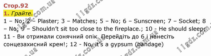 1. Грайте. 1 – No; 2 – Plaster; 3 – Matches; 5 – No; 6 – Sunscreen; 7 – Socket; 8 – No; 9 – Shouldn’t sit too close to the fireplace.; 10 - He should sleep; 11 - Ви отримали сонячний опік. Перейдіть до 6 і нанесіть сонцезахисний крем!; 12 - No, it’s a gypsum (bandage)