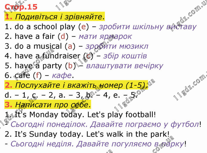 Подивіться і зрівняйте. 1. do a school play (e) – зробити шкільну виставу 2. have a fair (d) – мати ярмарок 3. do a musical (a) – зробити мюзикл 4. have a fundraiser (c) – збір коштів 5. have a party (b) – влаштувати вечірку 6. cafe (f) – кафе. 2. Послухайте і вкажіть номер (1-5). d. – 1, c. – 2, a. – 3, b. – 4, e. – 5. 3. Написати про себе. 1. It's Monday today. Let's play football! - Сьогодні понеділок. Давайте пограємо у футбол! 2. It's Sunday today. Let's walk in the park! - Сьогодні неділя. Давайте погуляємо в парку!