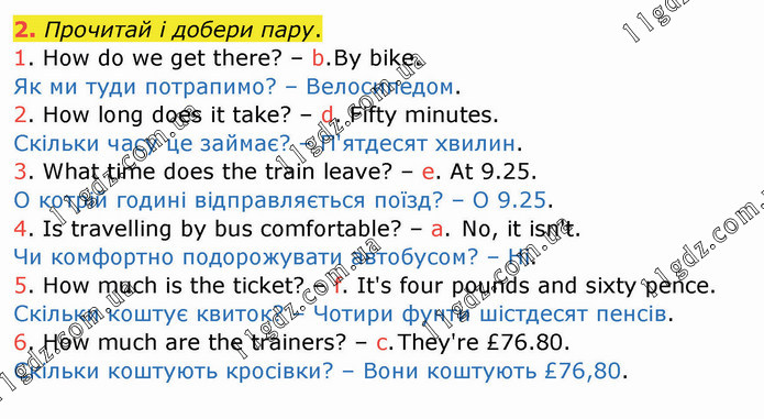 Прочитай і добери пару. 1. How do we get there? – b. By bike. Як ми туди потрапимо? – Велосипедом. 2. How long does it take? – d. Fifty minutes. Скільки часу це займає? – П'ятдесят хвилин. 3. What time does the train leave? – e. At 9.25. О котрій годині відправляється поїзд? – О 9.25. 4. Is travelling by bus comfortable? – a. No, it isn't. Чи комфортно подорожувати автобусом? – Ні. 5. How much is the ticket? – f. It's four pounds and sixty pence. Скільки коштує квиток? – Чотири фунти шістдесят пенсів. 6. How much are the trainers? – c. They're £76.80. Скільки коштують кросівки? – Вони коштують £76,80.