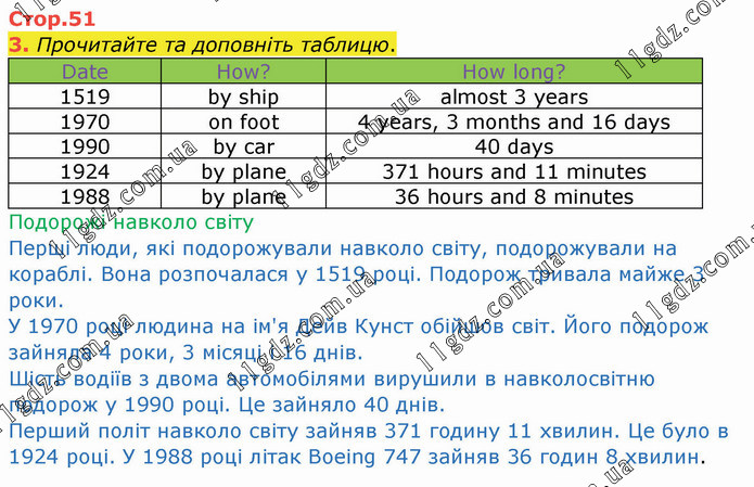 Прочитайте та доповніть таблицю. Date How? How long? 1519 by ship almost 3 years 1970 on foot 4 years, 3 months and 16 days 1990 by car 40 days 1924 by plane 371 hours and 11 minutes 1988 by plane 36 hours and 8 minutes Подорожі навколо світу Перші люди, які подорожували навколо світу, подорожували на кораблі. Вона розпочалася у 1519 році. Подорож тривала майже 3 роки. У 1970 році людина на ім'я Дейв Кунст обійшов світ. Його подорож зайняла 4 роки, 3 місяці і 16 днів. Шість водіїв з двома автомобілями вирушили в навколосвітню подорож у 1990 році. Це зайняло 40 днів. Перший політ навколо світу зайняв 371 годину 11 хвилин. Це було в 1924 році. У 1988 році літак Boeing 747 зайняв 36 годин 8 хвилин.