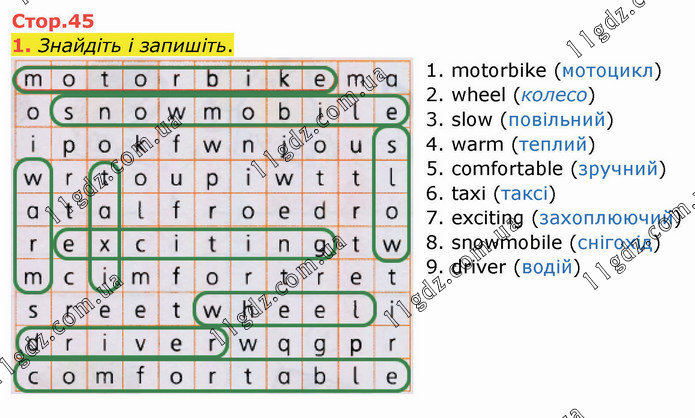 1. motorbike (мотоцикл) 2. wheel (колесо) 3. slow (повільний) 4. warm (теплий) 5. comfortable (зручний) 6. taxi (таксі) 7. exciting (захоплюючий) 8. snowmobile (снігохід) 9. driver (водій)