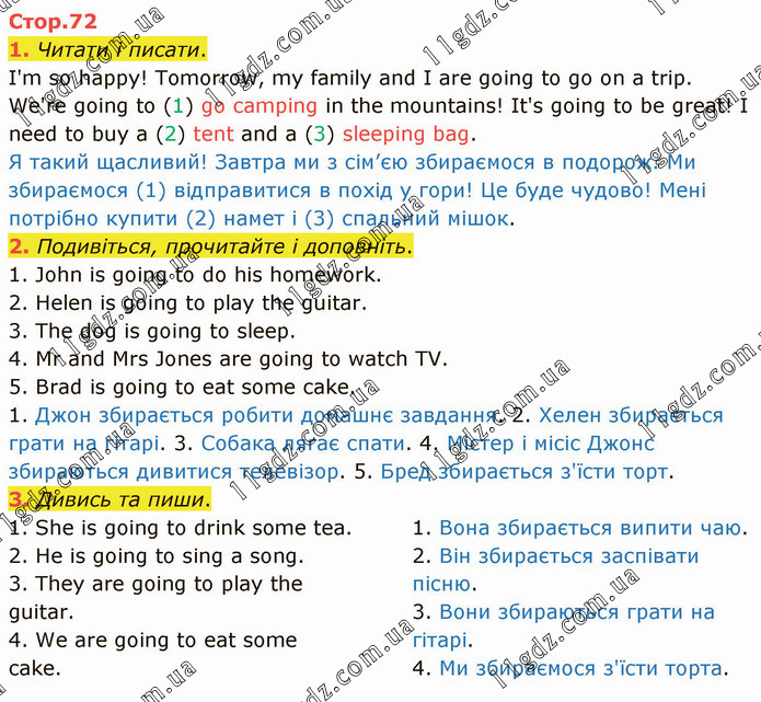 Читати і писати. I'm so happy! Tomorrow, my family and I are going to go on a trip. We're going to (1) go camping in the mountains! It's going to be great! I need to buy a (2) tent and a (3) sleeping bag. Я такий щасливий! Завтра ми з сім’єю збираємося в подорож. Ми збираємося (1) відправитися в похід у гори! Це буде чудово! Мені потрібно купити (2) намет і (3) спальний мішок. 2. Подивіться, прочитайте і доповніть. 1. John is going to do his homework. 2. Helen is going to play the guitar. 3. The dog is going to sleep. 4. Mr and Mrs Jones are going to watch TV. 5. Brad is going to eat some cake. 1. Джон збирається робити домашнє завдання. 2. Хелен збирається грати на гітарі. 3. Собака лягає спати. 4. Містер і місіс Джонс збираються дивитися телевізор. 5. Бред збирається з'їсти торт. 3. Дивись та пиши. 1. She is going to drink some tea. 2. He is going to sing a song. 3. They are going to play the guitar. 4. We are going to eat some cake. 1. Вона збирається випити чаю. 2. Він збирається заспівати пісню. 3. Вони збираються грати на гітарі. 4. Ми збираємося з'їсти торта.