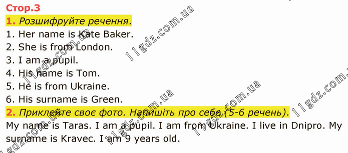 1. Розшифруйте речення. 1. Her name is Kate Baker. 2. She is from London. 3. I am a pupil. 4. His name is Tom. 5. He is from Ukraine. 6. His surname is Green. 2. Приклейте своє фото. Напишіть про себе (5-6 речень). My name is Taras. I am a pupil. I am from Ukraine. I live in Dnipro. My surname is Kravec. I am 9 years old.