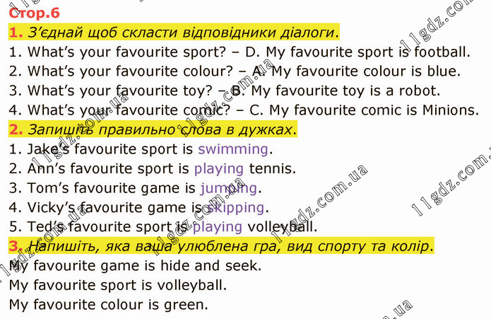 З’єднай щоб скласти відповідники діалоги. 1. What’s your favourite sport? – D. My favourite sport is football. 2. What’s your favourite colour? – A. My favourite colour is blue. 3. What’s your favourite toy? – B. My favourite toy is a robot. 4. What’s your favourite comic? – C. My favourite comic is Minions. 2. Запишіть правильно слова в дужках. 1. Jake’s favourite sport is swimming. 2. Ann’s favourite sport is playing tennis. 3. Tom’s favourite game is jumping. 4. Vicky’s favourite game is skipping. 5. Ted’s favourite sport is playing volleyball. 3. Напишіть, яка ваша улюблена гра, вид спорту та колір. My favourite game is hide and seek. My favourite sport is volleyball. My favourite colour is green.