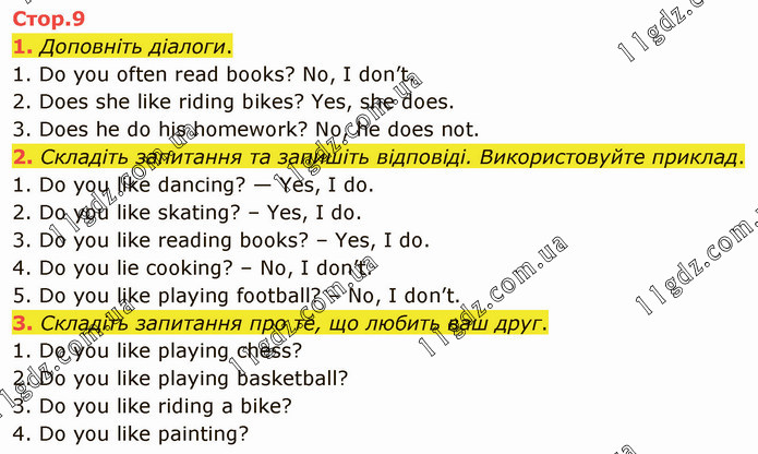 Доповніть діалоги. 1. Do you often read books? No, I don’t. 2. Does she like riding bikes? Yes, she does. 3. Does he do his homework? No, he does not. 2. Складіть запитання та запишіть відповіді. Використовуйте приклад. 1. Do you like dancing? — Yes, I do. 2. Do you like skating? – Yes, I do. 3. Do you like reading books? – Yes, I do. 4. Do you lie cooking? – No, I don’t. 5. Do you like playing football? – No, I don’t. 3. Складіть запитання про те, що любить ваш друг. 1. Do you like playing chess? 2. Do you like playing basketball? 3. Do you like riding a bike? 4. Do you like painting?