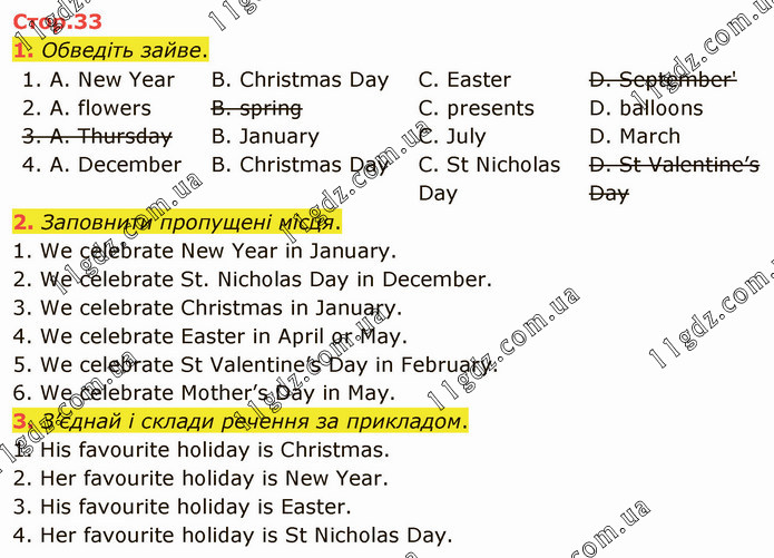 Заповнити пропущені місця. 1. We celebrate New Year in January. 2. We celebrate St. Nicholas Day in December. 3. We celebrate Christmas in January. 4. We celebrate Easter in April or May. 5. We celebrate St Valentine’s Day in February. 6. We celebrate Mother’s Day in May. 3. З’єднай і склади речення за прикладом. 1. His favourite holiday is Christmas. 2. Her favourite holiday is New Year. 3. His favourite holiday is Easter. 4. Her favourite holiday is St Nicholas Day.