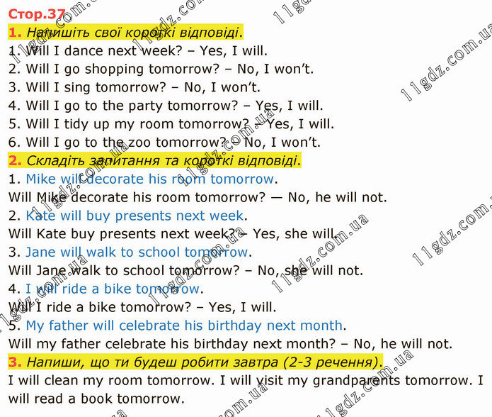 Напишіть свої короткі відповіді. 1. Will I dance next week? – Yes, I will. 2. Will I go shopping tomorrow? – No, I won’t. 3. Will I sing tomorrow? – No, I won’t. 4. Will I go to the party tomorrow? – Yes, I will. 5. Will I tidy up my room tomorrow? – Yes, I will. 6. Will I go to the zoo tomorrow? – No, I won’t. 2. Складіть запитання та короткі відповіді. 1. Mike will decorate his room tomorrow. Will Mike decorate his room tomorrow? — No, he will not. 2. Kate will buy presents next week. Will Kate buy presents next week? – Yes, she will. 3. Jane will walk to school tomorrow. Will Jane walk to school tomorrow? – No, she will not. 4. I will ride a bike tomorrow. Will I ride a bike tomorrow? – Yes, I will. 5. My father will celebrate his birthday next month. Will my father celebrate his birthday next month? – No, he will not. 3. Напиши, що ти будеш робити завтра (2-3 речення). I will clean my room tomorrow. I will visit my grandparents tomorrow. I will read a book tomorrow.
