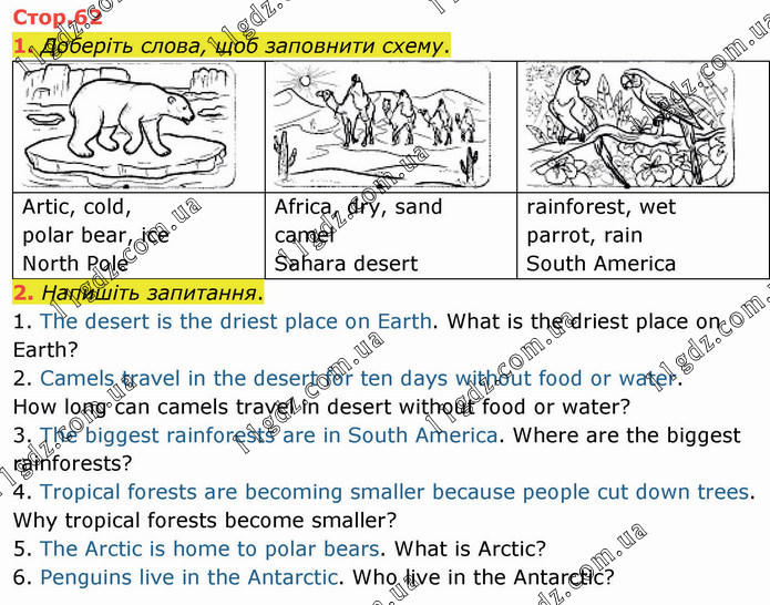 Напишіть запитання. 1. The desert is the driest place on Earth. What is the driest place on Earth? 2. Camels travel in the desert for ten days without food or water. How long can camels travel in desert without food or water? 3. The biggest rainforests are in South America. Where are the biggest rainforests? 4. Tropical forests are becoming smaller because people cut down trees. Why tropical forests become smaller? 5. The Arctic is home to polar bears. What is Arctic? 6. Penguins live in the Antarctic. Who live in the Antarctic?