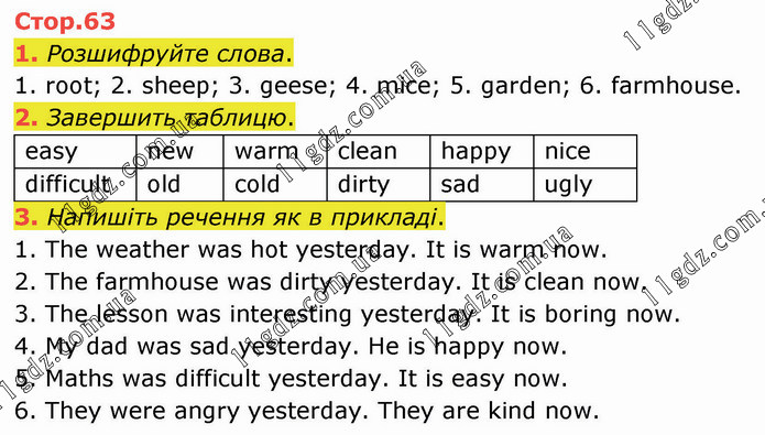 Напишіть речення як в прикладі. 1. The weather was hot yesterday. It is warm now. 2. The farmhouse was dirty yesterday. It is clean now. 3. The lesson was interesting yesterday. It is boring now. 4. My dad was sad yesterday. He is happy now. 5. Maths was difficult yesterday. It is easy now. 6. They were angry yesterday. They are kind now.