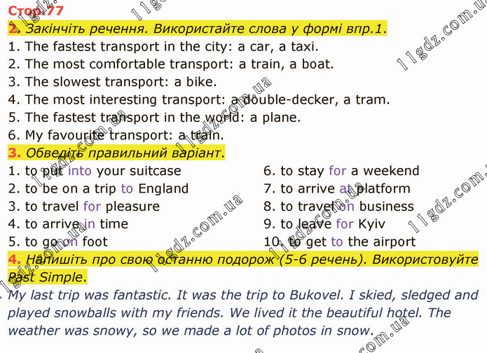 Закінчіть речення. Використайте слова у формі впр.1. 1. The fastest transport in the city: a car, a taxi. 2. The most comfortable transport: a train, a boat. 3. The slowest transport: a bike. 4. The most interesting transport: a double-decker, a tram. 5. The fastest transport in the world: a plane. 6. My favourite transport: a train. 3. Обведіть правильний варіант. 1. to put into your suitcase 2. to be on a trip to England 3. to travel for pleasure 4. to arrive in time 5. to go on foot 6. to stay for a weekend 7. to arrive at platform 8. to travel on business 9. to leave for Kyiv 10. to get to the airport 4. Напишіть про свою останню подорож (5-6 речень). Використовуйте Past Simple. My last trip was fantastic. It was the trip to Bukovel. I skied, sledged and played snowballs with my friends. We lived it the beautiful hotel. The weather was snowy, so we made a lot of photos in snow.