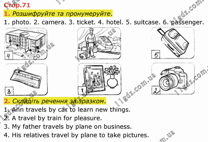 Складіть речення за зразком. 1. Ann travels by car to learn new things. 2. A travel by train for pleasure. 3. My father travels by plane on business. 4. His relatives travel by plane to take pictures.