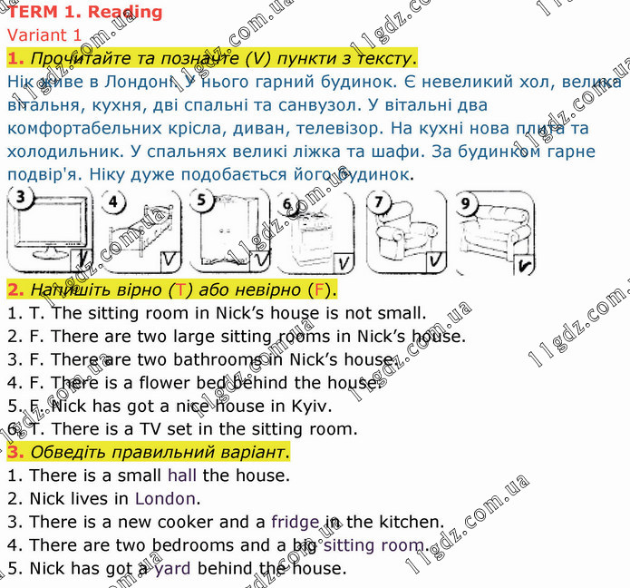Прочитайте та позначте (V) пункти з тексту. Нік живе в Лондоні. У нього гарний будинок. Є невеликий хол, велика вітальня, кухня, дві спальні та санвузол. У вітальні два комфортабельних крісла, диван, телевізор. На кухні нова плита та холодильник. У спальнях великі ліжка та шафи. За будинком гарне подвір'я. Ніку дуже подобається його будинок. 2. Напишіть вірно (Т) або невірно (F). 1. T. The sitting room in Nick’s house is not small. 2. F. There are two large sitting rooms in Nick’s house. 3. F. There are two bathrooms in Nick’s house. 4. F. There is a flower bed behind the house. 5. F. Nick has got a nice house in Kyiv. 6. T. There is a TV set in the sitting room. 3. Обведіть правильний варіант. 1. There is a small hall the house. 2. Nick lives in London. 3. There is a new cooker and a fridge in the kitchen. 4. There are two bedrooms and a big sitting room. 5. Nick has got a yard behind the house.