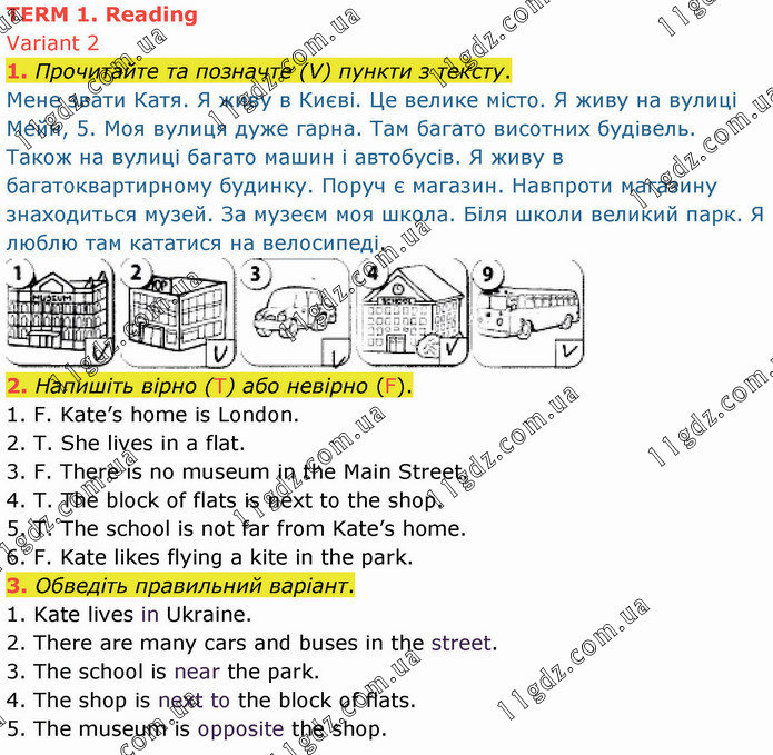 Прочитайте та позначте (V) пункти з тексту. Мене звати Катя. Я живу в Києві. Це велике місто. Я живу на вулиці Мейн, 5. Моя вулиця дуже гарна. Там багато висотних будівель. Також на вулиці багато машин і автобусів. Я живу в багатоквартирному будинку. Поруч є магазин. Навпроти магазину знаходиться музей. За музеєм моя школа. Біля школи великий парк. Я люблю там кататися на велосипеді. 2. Напишіть вірно (Т) або невірно (F). 1. F. Kate’s home is London. 2. T. She lives in a flat. 3. F. There is no museum in the Main Street. 4. T. The block of flats is next to the shop. 5. T. The school is not far from Kate’s home. 6. F. Kate likes flying a kite in the park. 3. Обведіть правильний варіант. 1. Kate lives in Ukraine. 2. There are many cars and buses in the street. 3. The school is near the park. 4. The shop is next to the block of flats. 5. The museum is opposite the shop.