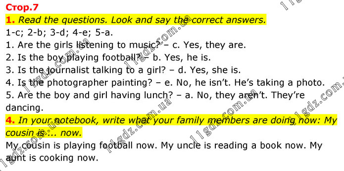 1. Read the questions. Look and say the correct answers. 1-с; 2-b; 3-d; 4-e; 5-a. 1. Are the girls listening to music? – c. Yes, they are. 2. Is the boy playing football? – b. Yes, he is. 3. Is the journalist talking to a girl? – d. Yes, she is. 4. Is the photographer painting? – e. No, he isn’t. He’s taking a photo. 5. Are the boy and girl having lunch? – a. No, they aren’t. They’re dancing. 4. In your notebook, write what your family members are doing now: My cousin is ... now. My cousin is playing football now. My uncle is reading a book now. My aunt is cooking now.