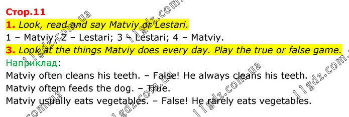 1. Look, read and say Matviy or Lestari. 1 – Matviy; 2 – Lestari; 3 – Lestari; 4 – Matviy. 3. Look at the things Matviy does every day. Play the true or false game. Наприклад: Matviy often cleans his teeth. – False! He always cleans his teeth. Matviy oftem feeds the dog. – True. Matviy usually eats vegetables. – False! He rarely eats vegetables.
