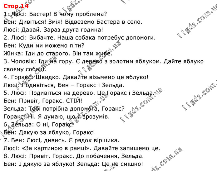 1. Люсі: Бастер! В чому проблема? Бен: Дивіться! Змія! Відвеземо Бастера в село. Люсі: Давай. Зараз друга година! 2. Люсі: Вибачте. Наша собака потребує допомоги. Бен: Куди ми можемо піти? Жінка: Іди до старого. Він там живе. 3. Чоловік: Іди на гору. Є дерево з золотим яблуком. Дайте яблуко своєму собаці. 4. Горакс: Швидко. Давайте візьмемо це яблуко! Люсі: Подивіться, Бен – Горакс і Зельда. 5. Люсі: Подивіться на дерево. Це Горакс і Зельда. Бен: Привіт, Горакс. СТІЙ! Зельда: Тобі потрібна допомога, Горакс? Горакс: Ні. Я думаю, що я зрозумів. 6. Зельда: О ні, Горакс! Бен: Дякую за яблуко, Горакс! 7. Бен: Люсі, дивись. Є рядок віршика. Люсі: «За картиною в рамці». Давайте запишемо це. 8. Люсі: Привіт, Горакс. До побачення, Зельда. Бен: І дякую за яблуко! Зельда: Це не смішно!