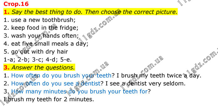 1. Say the best thing to do. Then choose the correct picture. 1. use a new toothbrush; 2. keep food in the fridge; 3. wash your hands often; 4. eat five small meals a day; 5. go out with dry hair 1-a; 2-b; 3-c; 4-d; 5-e. 3. Answer the questions. 1. How often do you brush your teeth? I brush my teeth twice a day. 2. How often do you see a dentist? I see a dentist very seldom. 3. How many minutes do you brush your teeth for? I brush my teeth for 2 minutes.